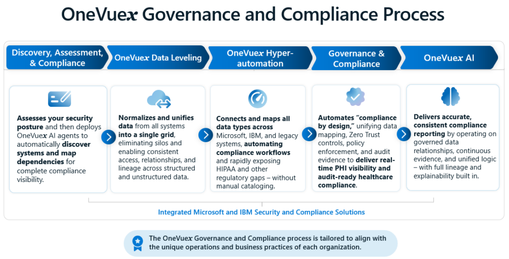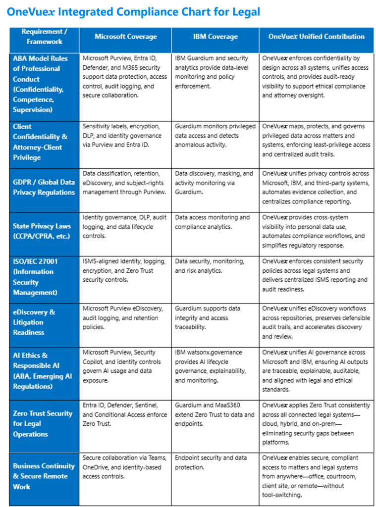 While Microsoft and IBM supply the technical safeguards, cloud protections, AI governance controls, and compliance‑ready infrastructure, OneVuex provides the unifying intelligence and automation that make cross‑platform compliance practical, consistent, and resilient.