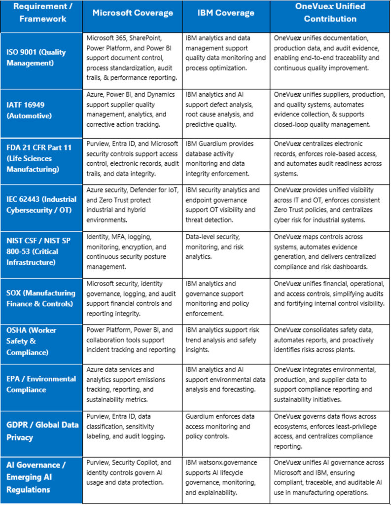 While Microsoft and IBM supply the technical safeguards, cloud protections, AI governance controls, and compliance‑ready infrastructure, OneVuex provides the unifying intelligence and automation that make cross‑platform compliance practical, consistent, and resilient.