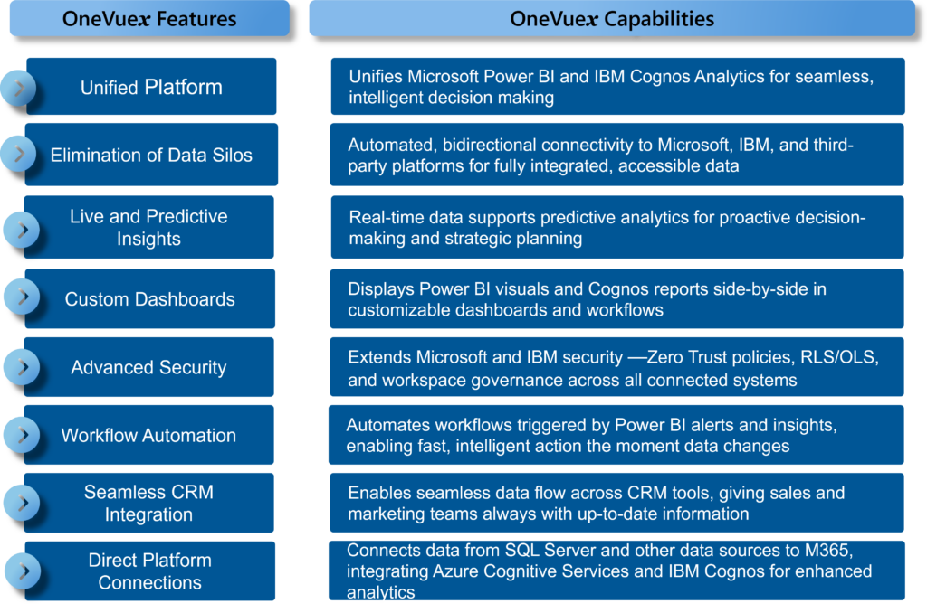 | OneVuex Analytics unifies Microsoft Power BI and IBM Cognos Analytics together into one seamless, intelligent decision platform. Through OneVuex’s Code Integration Technology, Hyper‑Automation, and AI‑driven orchestration, enterprises gain seamless access to governed, real‑time insights from both Business Intelligent engines—presented within one secure, workflow‑aware interface. | ![]() |
