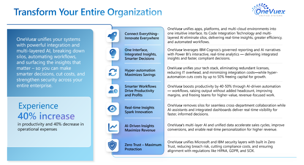 OneVuex transforms fragmented environments into an intelligent, integrated enterprise—enabling faster growth, lower costs, stronger security, and a more productive workforce. It is not just a platform; it is the technology foundation that allows your enterprise to innovate at scale, operate with agility, and compete with confidence in the age of AI.
