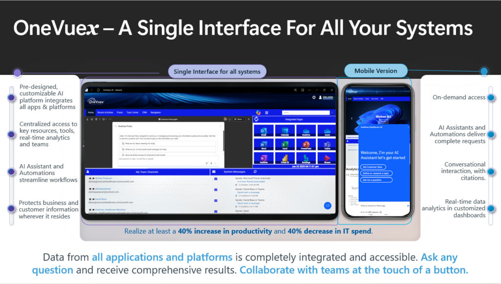In today’s face-paced business environment, enterprise organizations struggle with fragmented systems, siloed data, operational bottlenecks, and escalating costs and complexities associated with digital transformation. OneVuex brings your entire technology ecosystem together, delivering the unified tools and intelligent interface your teams need to excel in the Modern Workplace.