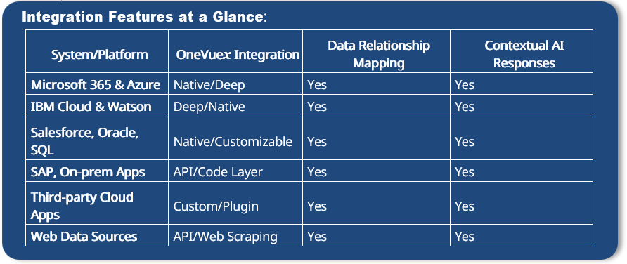 Unlike many competitors, OneVuex’s code integration approach ensures that new integrations are not limited by predefined connectors; instead, flexible APIs and proprietary scripts can bring virtually any digital tool or silo into the unified system.